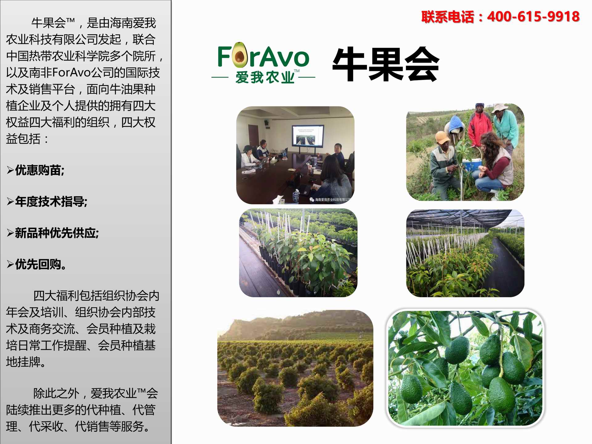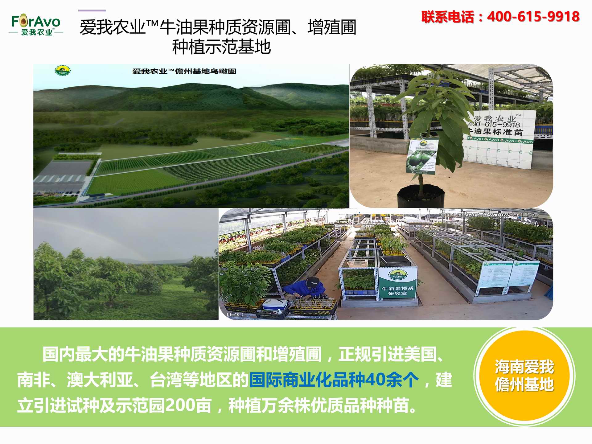 海南愛我農(nóng)業(yè)科技有限公司是一家綜合性的高科技農(nóng)業(yè)發(fā)展企業(yè),旗下愛我農(nóng)業(yè)TM致力于打造中國最大最強的牛油果種植企業(yè)。依托美國、南非、澳大利亞等擁有百年牛油果繁育、種植歷史以及產(chǎn)業(yè)鏈市場的優(yōu)勢,開展牛油果種苗繁育、種植技術(shù),種植加盟、深加工等產(chǎn)業(yè)。結(jié)合中國市場,面向廣大苗圃基地、種植農(nóng)場、合作加工等企業(yè),推出的適合規(guī)?;?、標準化的牛油果全產(chǎn)業(yè)鏈服務(wù)。 Hainan Foravo Agricultural Technology Co., Ltd. is a comprehensive high-tech agricultural development enterprise , dedicated to building the largest and most powerful avocado plantation enterprise in China. Relying on the advantage of avocado nursery, planting history, and the industrial chain over 100 years in the United States, South Africa, Australia, we are carrying out nursery, planting, proce...